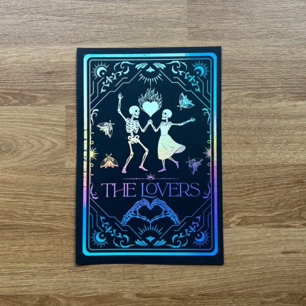 The Lovers embodies unity, trust, and the beauty of choice. Hand-pressed in gold or silver holographic foil, this design feels drenched in warmth and affection, the foil shifting like candlelight between two hearts.