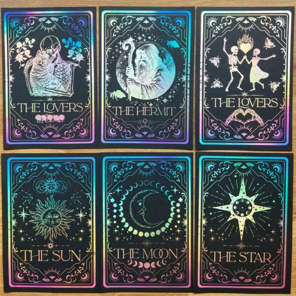 Our Lovers (Cat Edition) Tarot Foil Print celebrates the ultimate partnership — you and your feline familiar. This playful spin on the classic card is hand-pressed with gold or silver holographic foil, each glimmer shifting in the light like fur catching the sun.